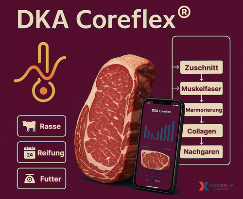 Die klassische Logik „56 °C = Medium“ greift bei moderner Fleischqualität zu kurz. Zu viele Faktoren werden ignoriert: Fleischtyp, Reifung, Wassergehalt, Faserstruktur, Marmorierung, Fütterung, Tierkategorie und Zuschnitt. Die DKA Coreflex® App übersetzt die Dynamische Kerntemperatur-Analyse (DKA) in ein Werkzeug mit einem klaren Ergebnis: die passende Kerntemperatur für genau dieses Stück Fleisch – für optimale Textur, Saftigkeit und Aroma.